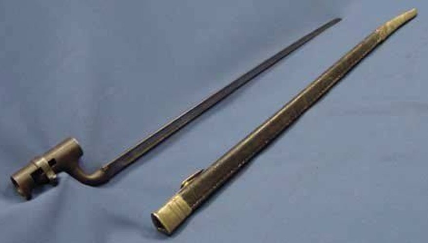 Identify the shape and size of Civil War-era bayonets. Many Civil War bayonets (though not all) were socket-style, meaning they had a hole that slipped over the muzzle of the gun and locked into place. The socket bayonet was the most widely used during the war. Modern and some pre-war bayonets clipped or snapped the knife, sword or dagger into place at the end of the gun. Many bayonets have an attached leather frog used to help hold the bayonet in place on the gun. Many of the leather parts have not survived through the decades; if you see an intact leather piece with a bayonet, it may very well be a reproduction even if the metal is original. Enfield rifles could be fixed with a variation on the bayonet, a sword with a loop on the handle that slid into place on the rifle.